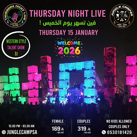 It’s an entertainment and tourism event combined together in the nature, perfect for enjoying your weekend. It features comedy acts, a DJ, and talent shows, all in a beautiful area setting with soft, enchanting lighting, just 30 minutes from anywhere in Jeddah.